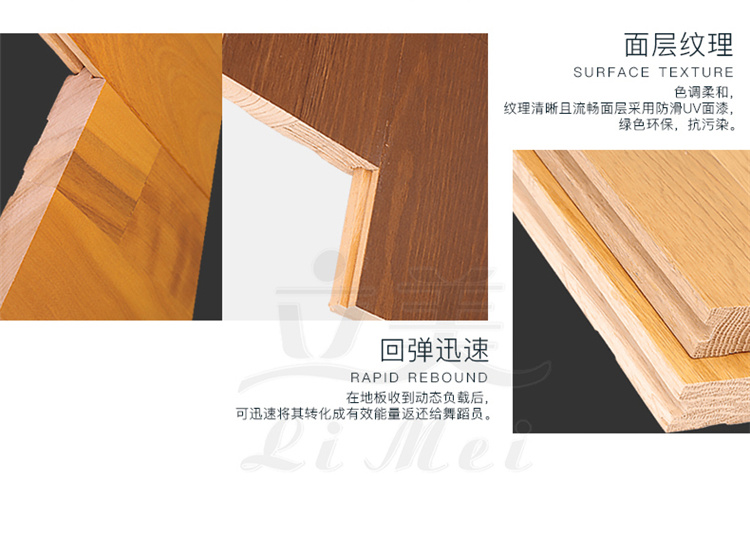 2、舞台木地板软硬佳更舒适:舞台木地板材质过硬,缓冲力就大大减弱,会对舞者的身体造成慢性的损伤,所以,过硬的材质不适宜做舞台木地板,软的舞台木地板有更好的减震性,但会减弱地板的能量回传,会增加舞蹈表演者的体力耗损。当在选择舞台木地板时一定要选择硬中有软的材质,只有软硬最佳的材质才能提供最舒适的弹性和独立弹簧性,如同装有独立簧的弹簧床一样,经久不变形,有效保护舞者腿和膝关节。