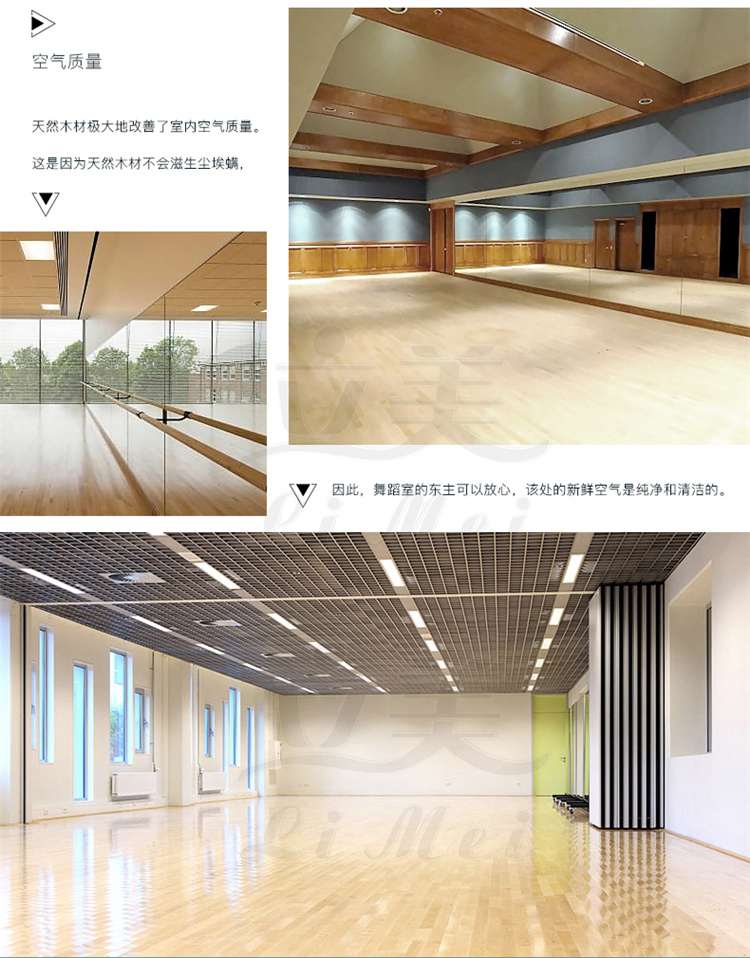 6、地板耗材少:舞台木地板可根据场地的尺寸量身定制,减少了耗材的产生,为舞蹈教室节约了安装成本。