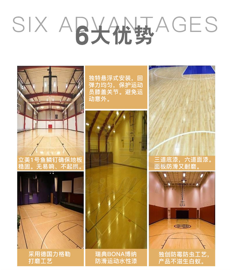 优良的冲击吸收性能可有效的避免运动员受到运动损伤。作为篮球场的体育木地板,还需要具有90%以上的球体反弹能力木地板大致可分为三大类:实木地板,实木复合地板、负离子木地板和强化木地板。实木地板